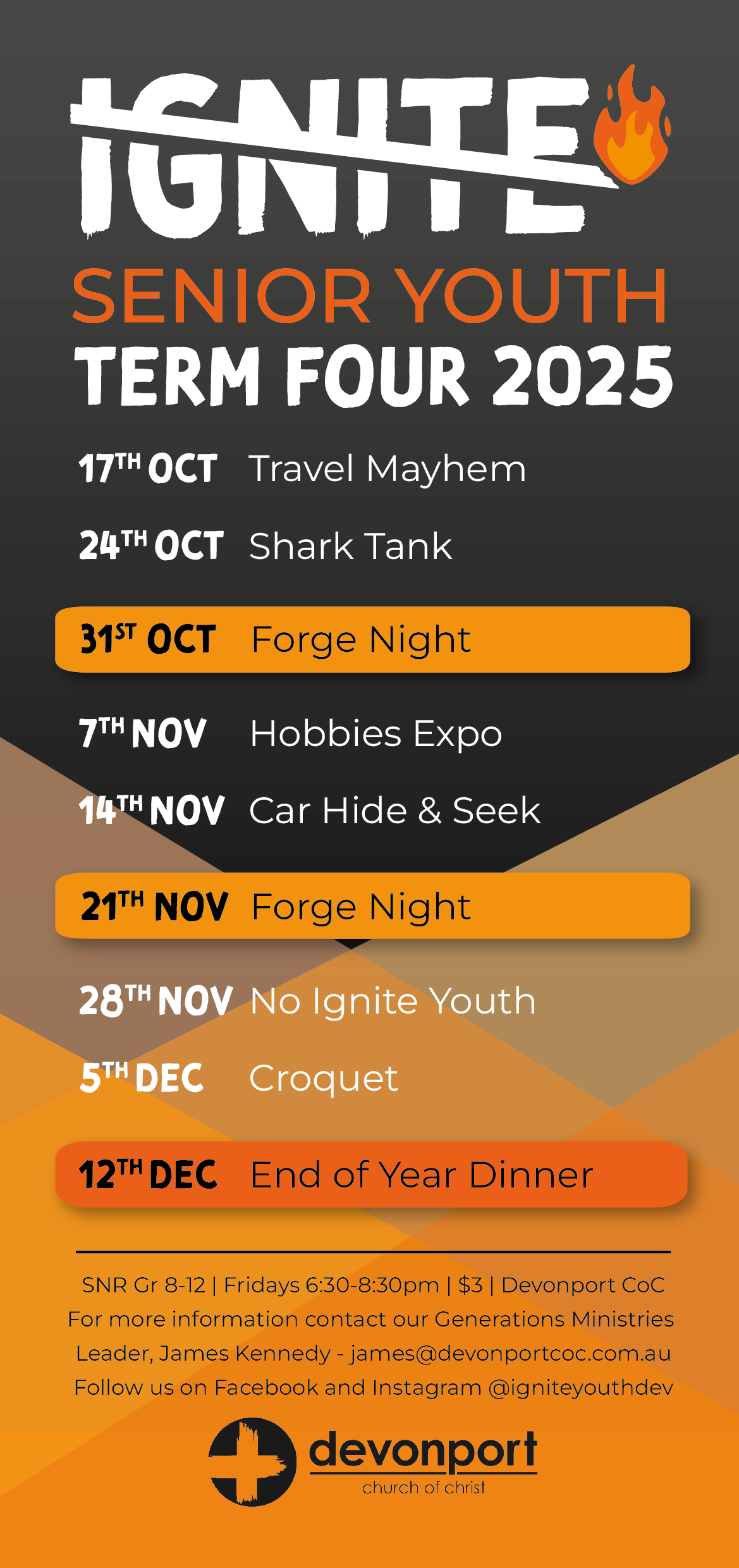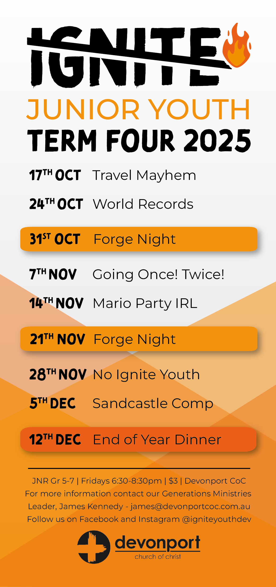 Unless otherwise advertised Ignite Youth meets at Devonport Church of Christ on Friday nights during school terms. Our events run from 6:30pm-8:30pm and cost $3